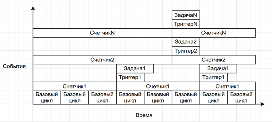 Данная методика основывается на построении работы программы таким образом, при котором основной алгоритм – повторяющийся цикл с жестко заданным временем выполнения и набором счетчиков, количество которых равно количеству выполняемых задач.