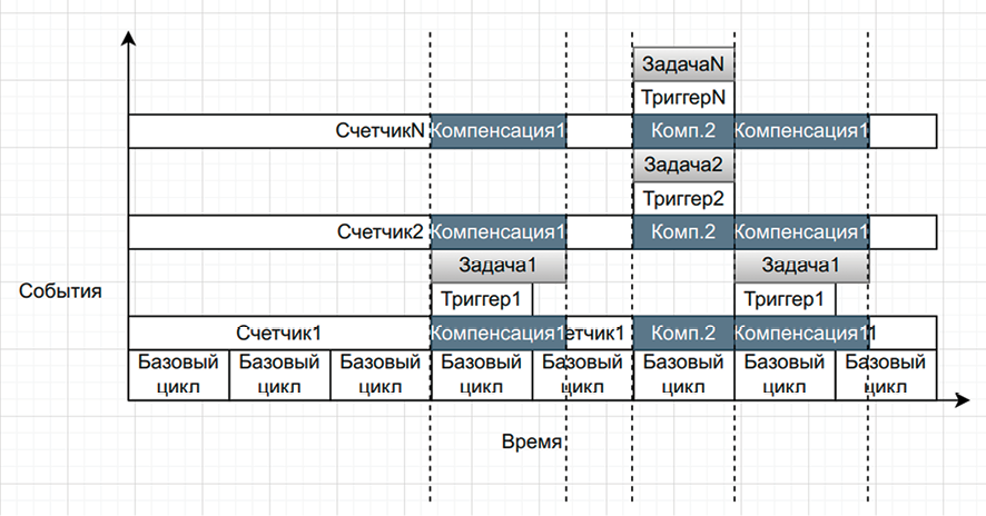 Второй этап: при срабатывании триггера и выполнении вышеуказанной задачи добавить ко всем счетчикам компенсационное значение, равное отношению Тзадачи к Тбазовогоцикла
