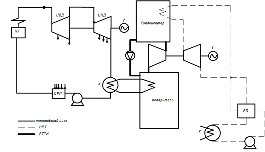 Предложение для расширения технологических возможностей паротурбинных установок заключается в объединении теплового насоса и органического цикла Ренкина. Тепловой насос, используя низкопотенциальное тепло конденсатора, подогревает рабочее тело органического цикла Ренкина или сетевую воду в требуемых объемах, позволяя использовать низкопотенциальное тепло конденсатора и уменьшая тепловое загрязнение.