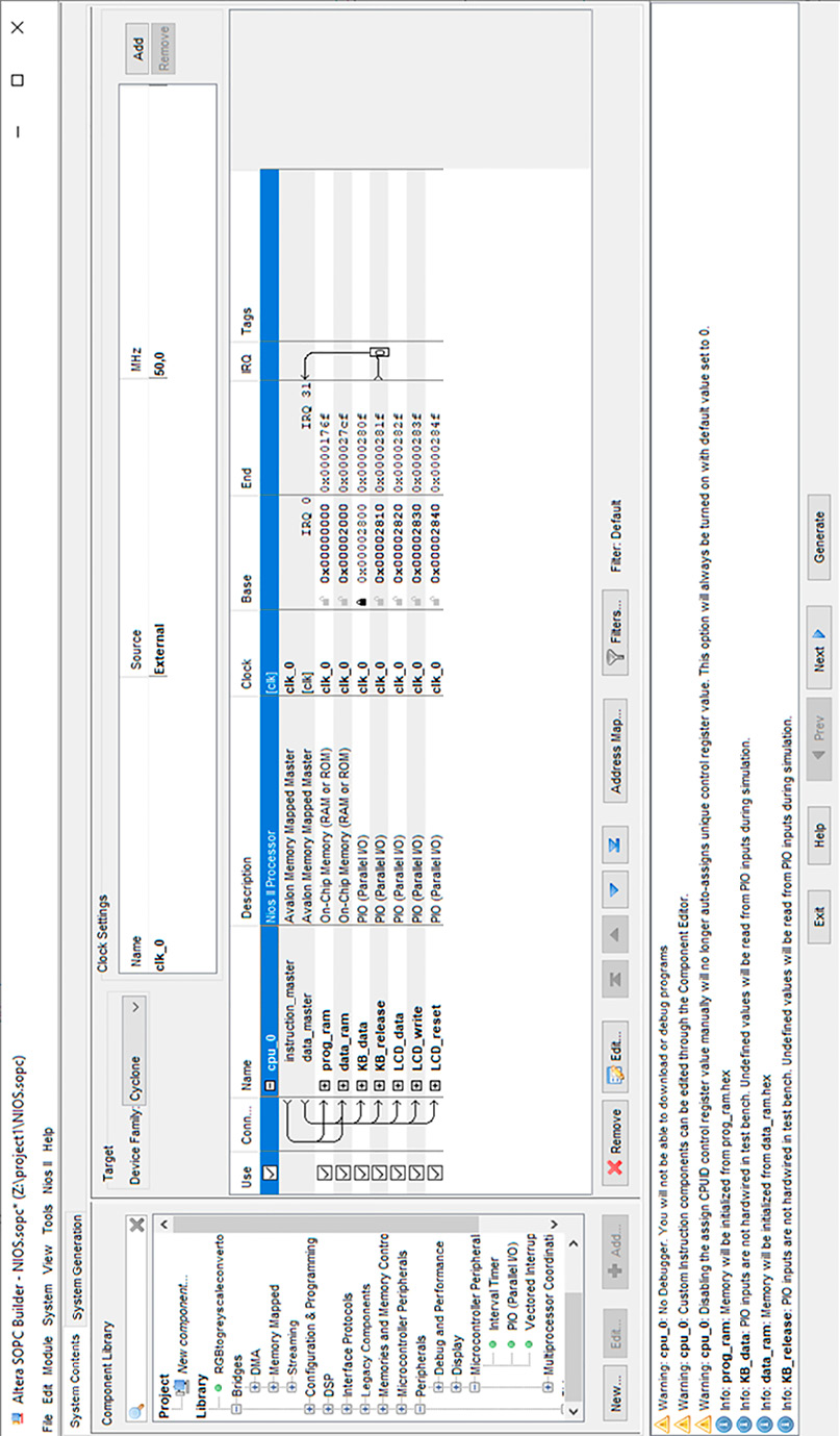 Конфигурирование вычислительного устройства осуществляется в программе SOPC Builder, в которой устройство определяется как файл системы на программируемом кристалле (СнПК). Программа, вызываемая из меню Tools, автоматизирует задачу объединения элементов аппаратуры в большую систему, в том числе за счет создания переключательной структуры Avalon.