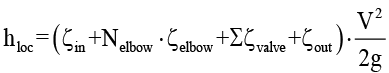 где ζin – коэффициент входного сопротивления; ζelbow – коэффициент одного поворота; Nelbow – число поворотов; ∑ζvalve – суммарное сопротивление регулирующих элементов; ζout – коэффициент выходного участка.