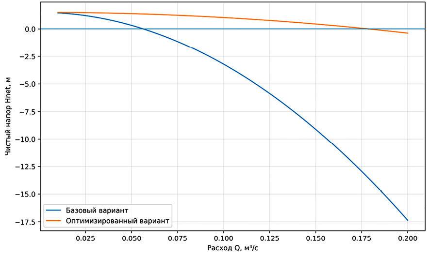 2) сохранял положительный чистый напор Hnet > 0 во всем практически значимом диапазоне расходов.