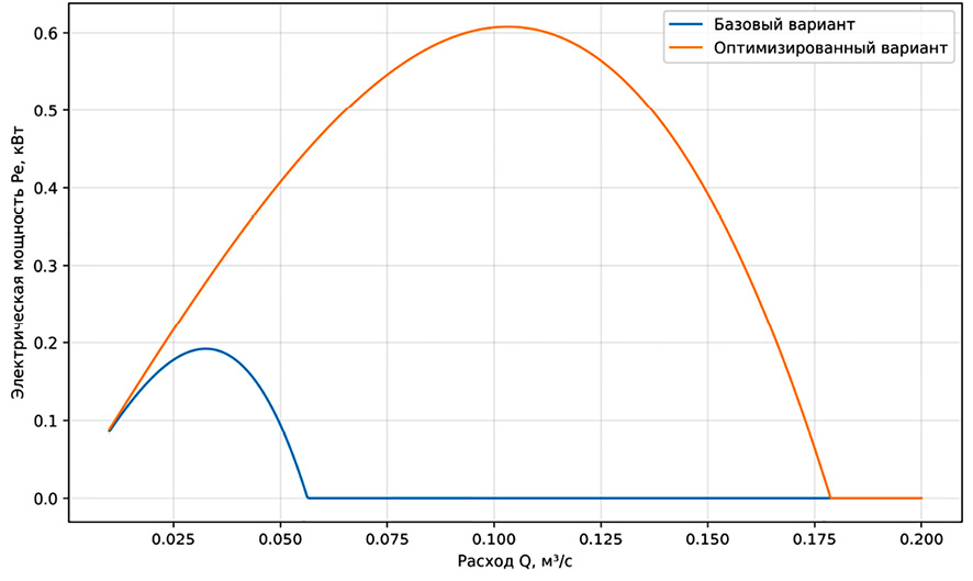 Сводные количественные результаты приведены в табл. 3. Уже на этом уровне видно, что оптимизация водоподвода оказывает выраженное влияние на все ключевые показатели системы. Прежде всего, предельный расход, при котором еще выполняется условие Hnet > 0, возрастает с 0,056 до 0,178 м³/с, то есть рабочий диапазон расширяется примерно в 3,18 раза. Одновременно с этим расход, соответствующий максимуму электрической мощности, смещается с 0,033 до 0,103 м³/с, а максимальная расчетная мощность увеличивается с 0,192 до 0,608 кВт. Следовательно, эффект оптимизации проявляется не в одном частном параметре, а в комплексном улучшении режима работы: возрастает и энергетический максимум, и диапазон расходов, в пределах которого установка сохраняет расчетную работоспособность.