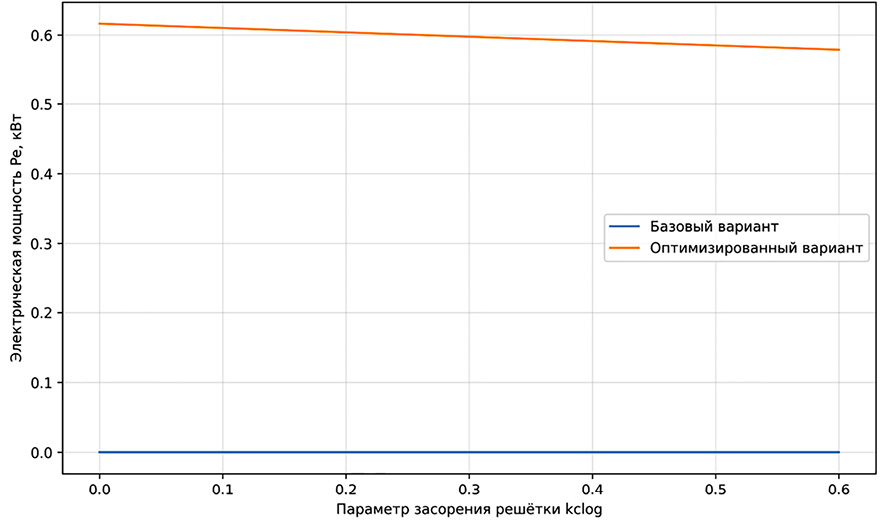 В оптимизированной схеме ситуация принципиально иная. Даже при росте параметра засорения от 0 до 0,60 мощность уменьшается лишь с 0,616 до 0,579 кВт, сохраняя при этом положительное значение на всем рассматриваемом интервале. Разумеется, количественный характер этой зависимости определяется принятой в работе линейной аппроксимацией роста сопротивления решетки. Тем не менее качественный вывод выглядит достаточно устойчивым: увеличение живого сечения решетки и снижение скоростей потока в подводящем тракте заметно уменьшают чувствительность установки к ухудшению состояния водозабора. Для низконапорной микроГЭС с нижнебойным колесом этот результат имеет особую значимость, поскольку именно водозаборный узел в подобных системах нередко становится тем элементом, который ограничивает эксплуатационную устойчивость всей схемы.